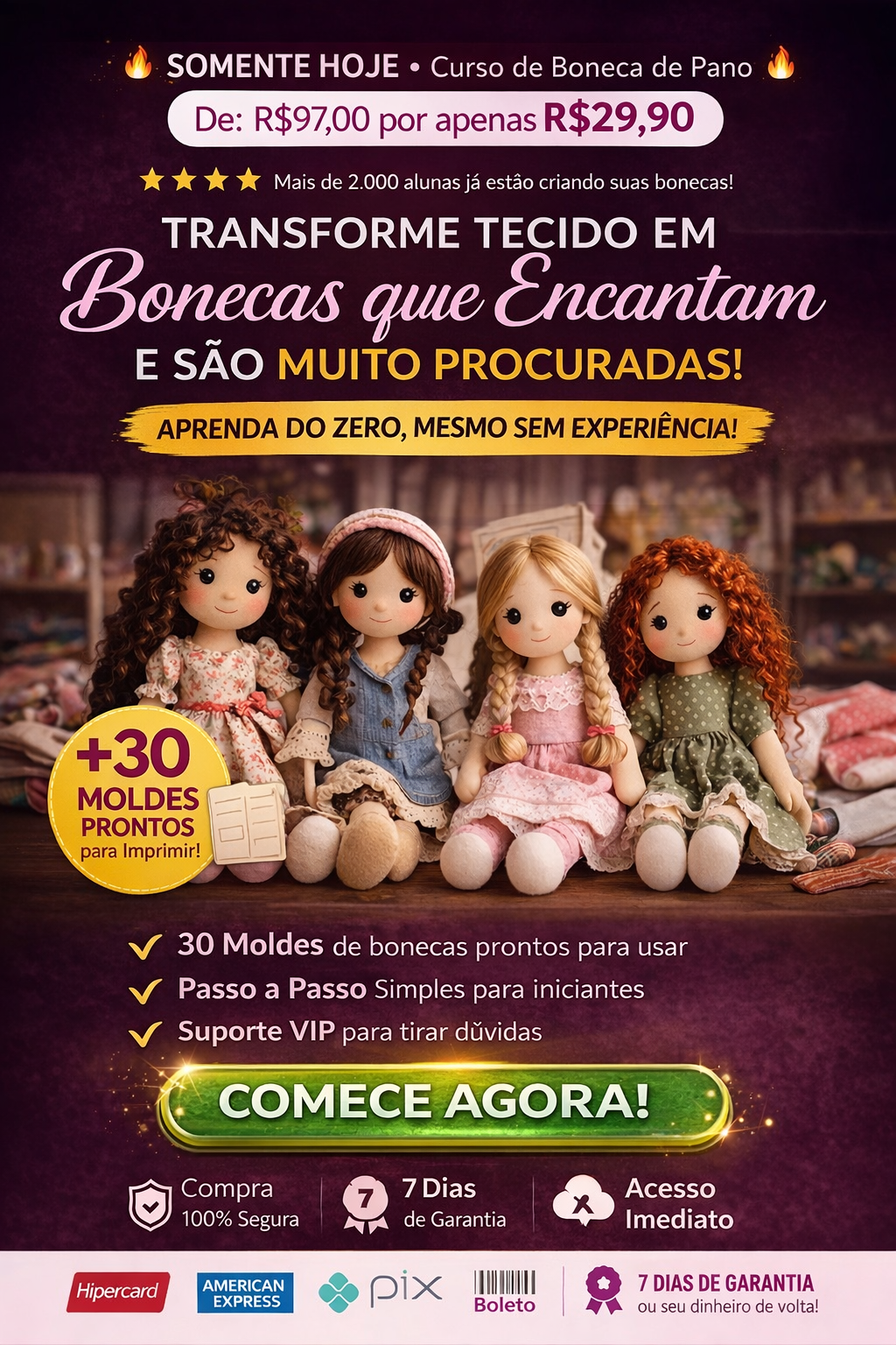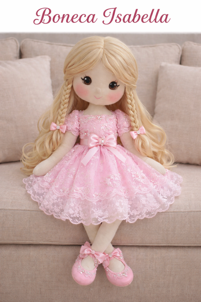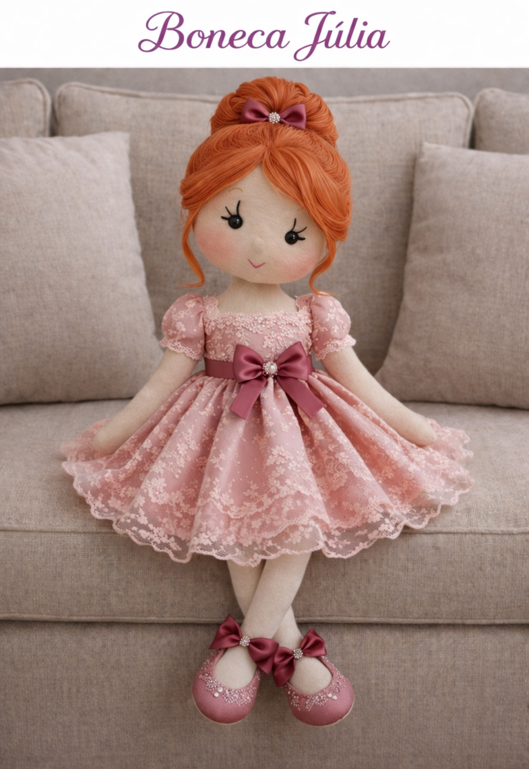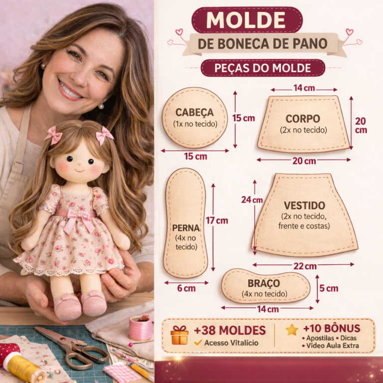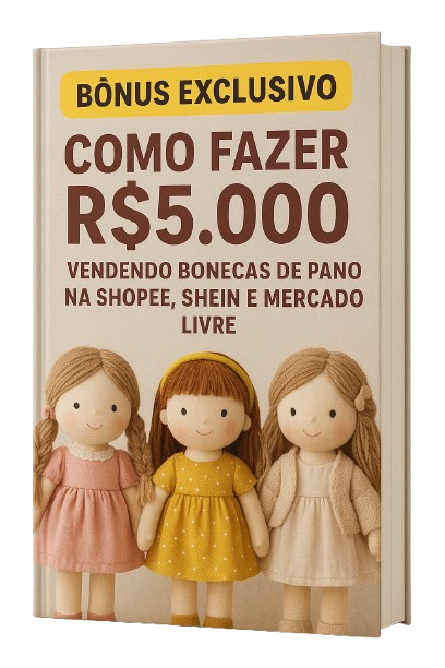 São mais de 30 modelos de bonecas com passo a passo e moldes prontos. Você também aprende a criar roupas e calçados para deixar as peças completas e com acabamento profissional. Produza em casa e transforme esse artesanato, vendendo bonecas que encantam.